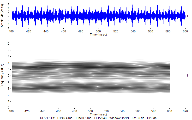 The first sonogram was produced with extremely high frequency resolution. As you can see, the lines are very thin. The second sonogram was made with extremely high time resolution. Now we see diagonal lines. They are not connected to each other in a zigzag, they are separate. I have to call this a trill. not a buzz. Notice how well the diagonals line up with the true sound, the wave form above. The resolution used by eBird is in between these extremes, and it generally reveals the frequency-time dynamics of the sound very well. But as you now know, it is only one of may ways of looking at a sound.