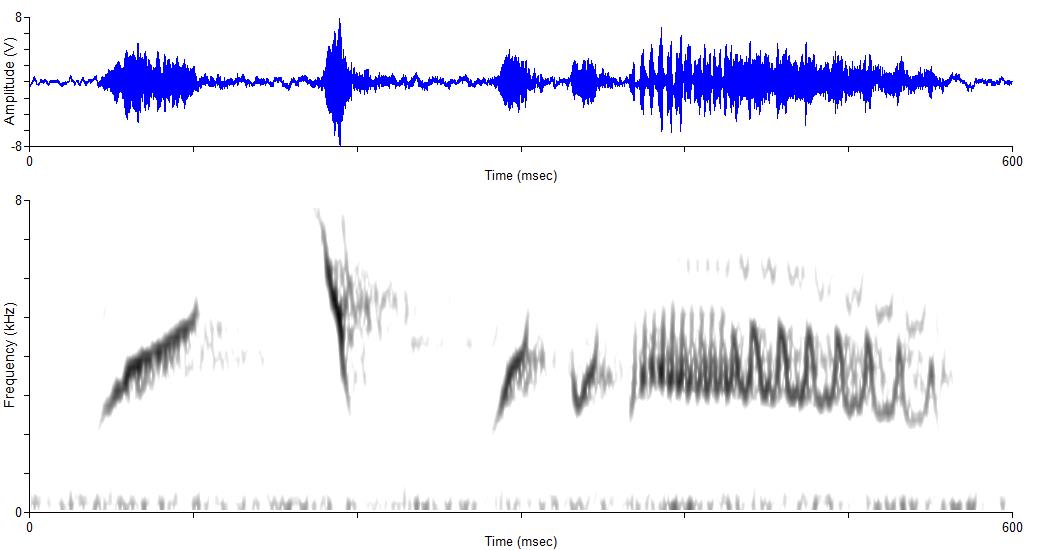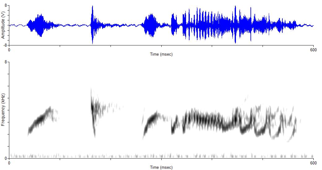 Below is a close-up from today's featured sonogram. The horizontal scale is more compact than above, so you can compare the two birds readily. The bird on the right has five broad peaks, like the New Mexico bird above. The left bird has six peaks. What does that tell us? Sedgwick did not publish the values for the number of peaks, but he did publish ranges for the width of a peak. For adastus it was 15.6-16.3 milliseconds. For extimus it was 26.6-32.1 milliseconds. The peak-width of the right bird is 28.6 milliseconds, marking him as a good extimus. The bird on the left, though, is problematic, with a peak-width of 18.0 milliseconds. That is outside the range of adastus, but close to it, and far from the values Sedgwick found from the lowlands of Arizona, Utah, and New Mexico for extimus. Sedgwick did not include the southern California populations in his study, but they are always treated as being members of extimus. One measurement from one song from one bird does not change that assessment, but it does give me pause, even though I am 100% in favor of protection for the Willow Flycatchers breeding in desert riparian vegetation. One thing we can say with confidence is that these two birds saw each other as rivals, regardless of their pedigrees.